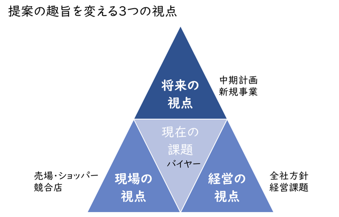 趣旨を「売れるようにしたい」に変えるには、視点を広げる必要があります。バイヤーが見ている景色を、3つの方向から捉えることが出発点になります。