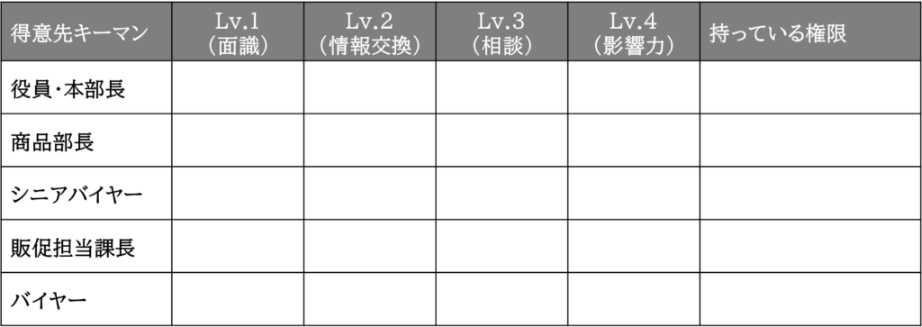 例えば、大きな提案や上位層へのアプローチには、権限を持つ商品部長クラスと「レベル3(相談される)」以上の関係が必要です。現在の関係性からレベルを上げるために「何をすべきか」という具体的なアクションを想定することができます。