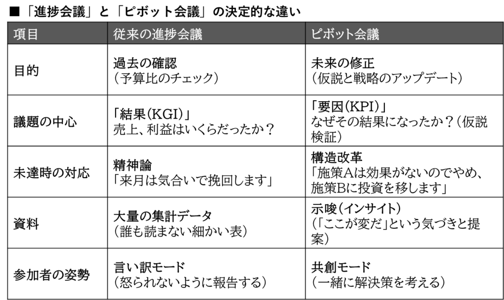 - 「仮説は正しかったか?」「次の一手はどうするか?」を議論し、軌道修正を行う場です。