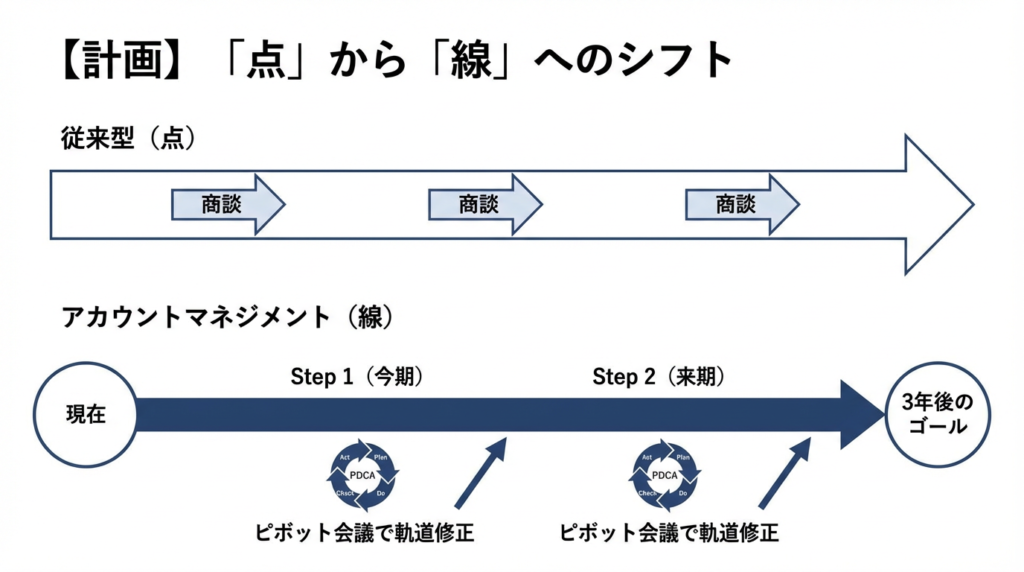 このロードマップがあることで、目の前のトラブルや担当変更があっても、プロジェクトはブレずに進み続けます。談は「売り込み」ではなく「計画の実行確認」へと変わり、商談の質は劇的に向上します。