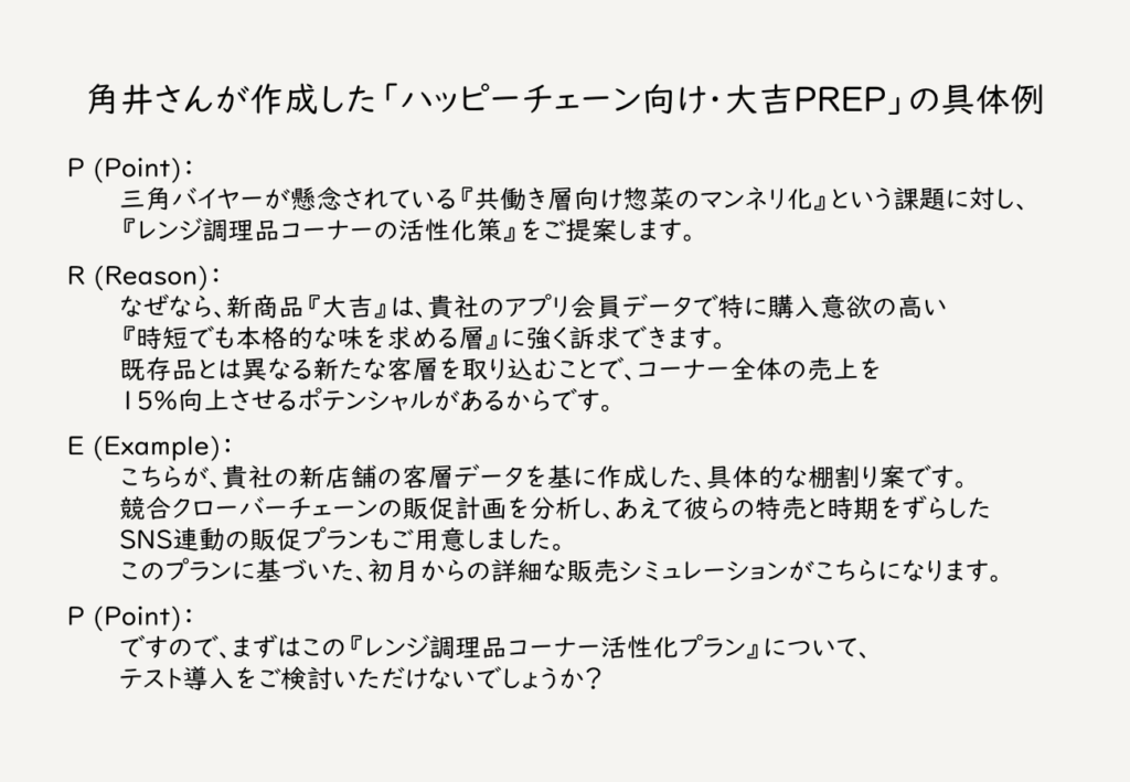 ここで、角井さんが「ハッピーチェーンの三角バイヤー」のためだけに作成した、真のPREP法の具体例を見てみましょう。