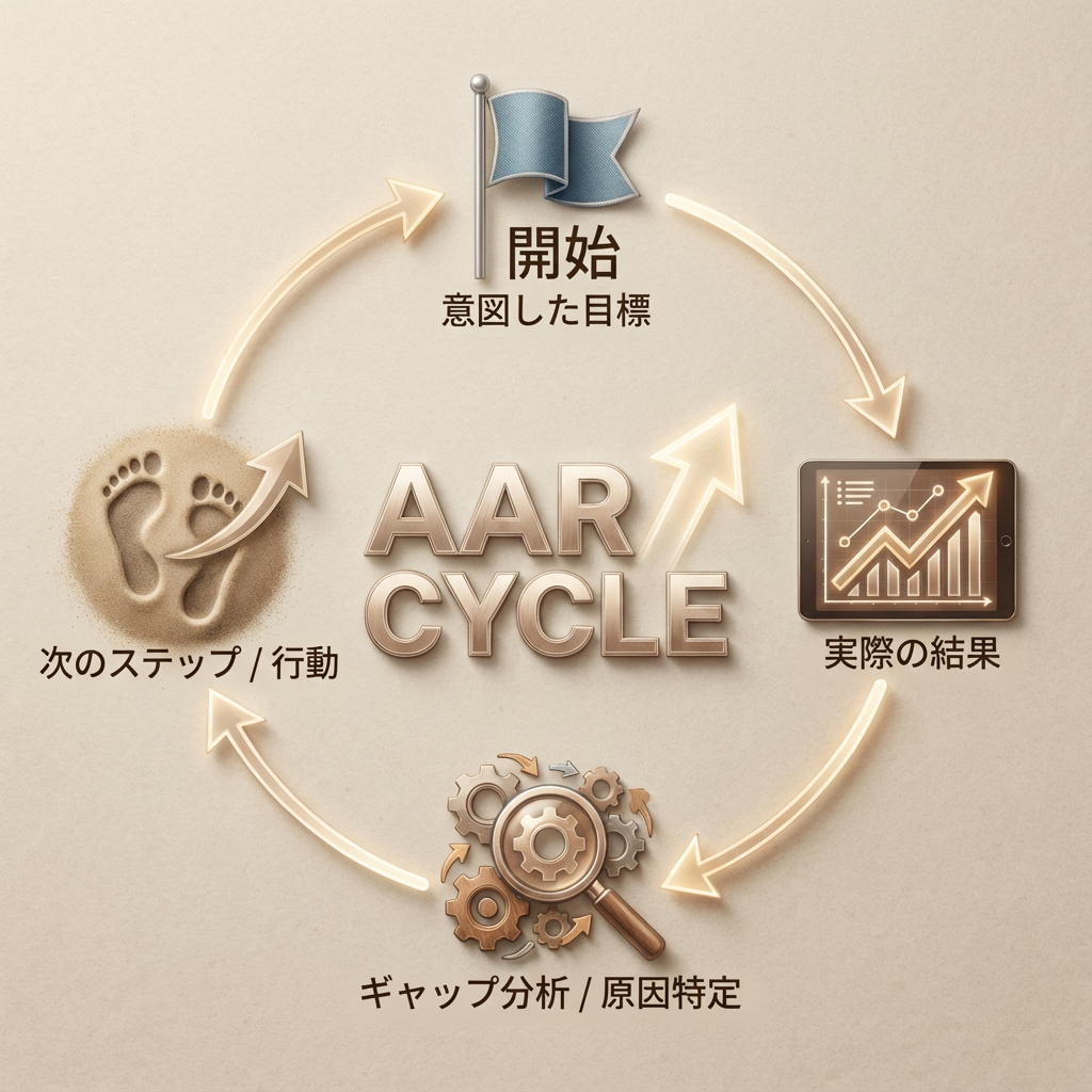 私たちは、米軍由来の振り返り手法(AAR)を応用し、以下の4点を確認する独自のラップアップ・メソッドを導入します。