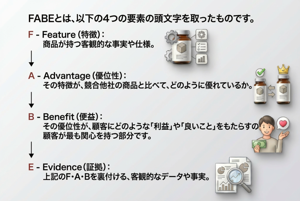 ストーリーができても、最後の商品説明で機能の羅列に戻ってしまっては台無しです。 「機能(Feature)」を語るのではなく、「ユーザーにとってどう役に立つのか(Benefit)」を語るためのフレームワークが「FABE分析」です。