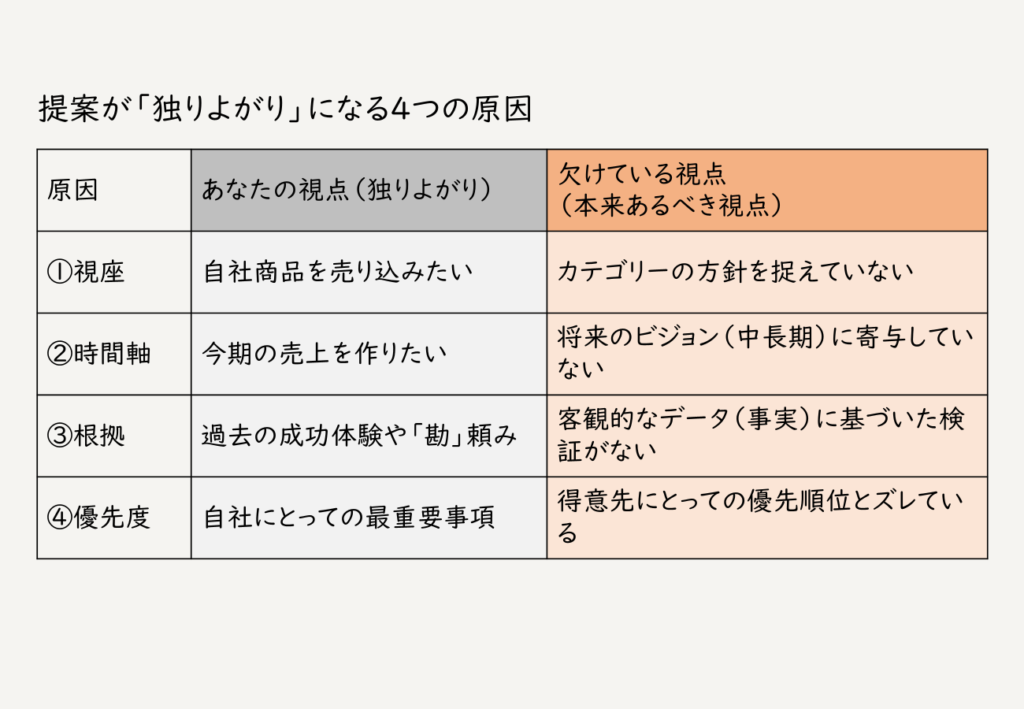 - 欠けている視点: 「得意先にとっての優先順位とズレている」