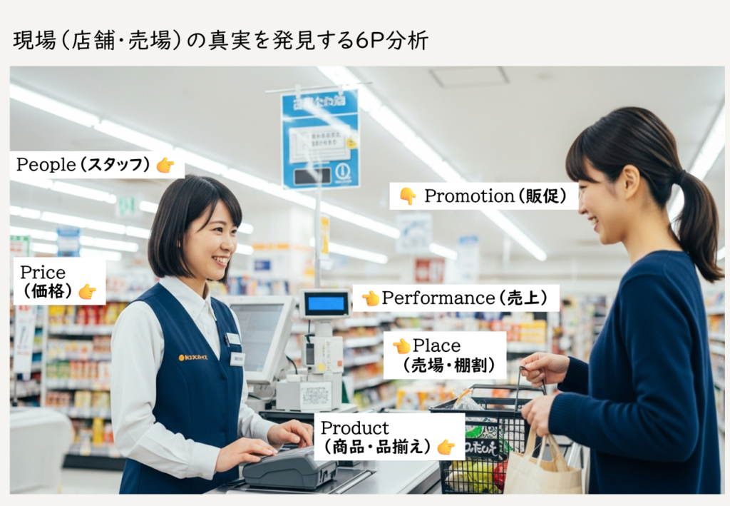 全ての出発点は「現場」にあります。しかし、漫然と店舗を眺めるだけでは課題は見えません。 多忙なバイヤーに代わり、売場の状態を抜け漏れなく把握するためのフレームワークが「6P分析」です。