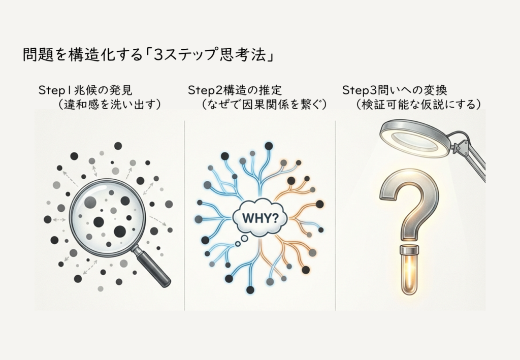 3.「問い」への変換: それを「〇〇が原因で、機会損失が起きているのではありませんか?」という、検証可能な「問い」の形にする。